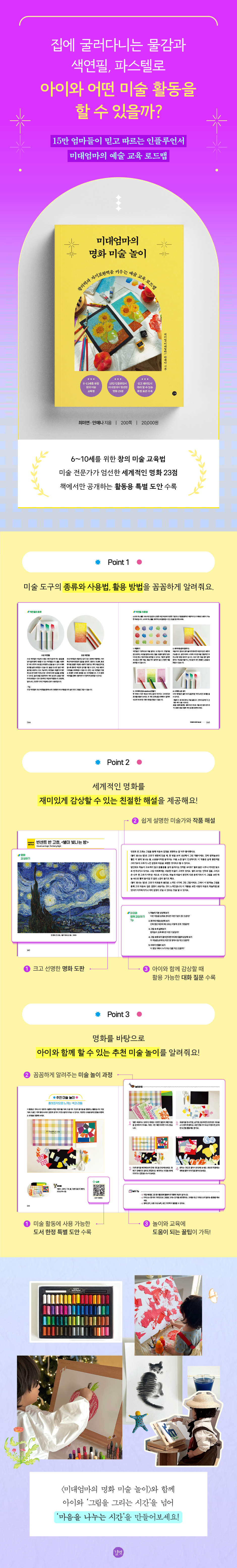 주말이나 연휴, 방학 시즌에는 아이와 함께 하는 활동으로 고민하게 되기 마련입니다. 즐겁게 하는 활동이 자연스레 교육으로 이어진다면 일석이조겠죠. 그 해답이 바로 여기에 있습니다. 15만 구독자의 신뢰를 받는 미술교육 인플루언서 ‘미대엄마’의 예술교육 로드맵 〈미대엄마의 명화 미술 놀이〉는 아이와 함께 여러 가지 미술 놀이를 경험하고 그 속에서 세계적인 명화와 미술 도구, 미술 표현을 배울 수 있는 시간을 선사합니다.