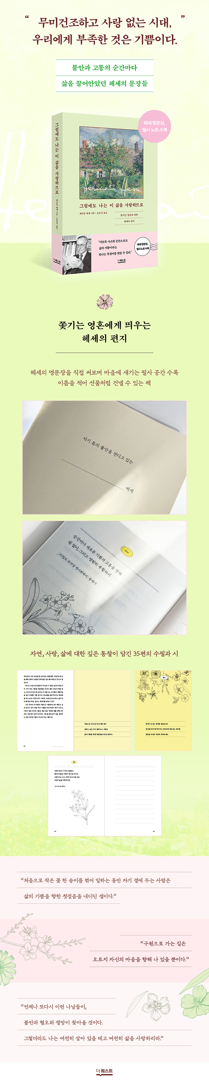 이 책은 헤르만 헤세의 수필과 시 중에서 일상의 행복과 자연을 향한 찬미, 고독과 치유, 자기 자신으로 살아가는 용기를 다룬 35편의 글을 엄선해 엮었다. 또한 헤세의 명문장을 직접 써보며 사유하는 ‘필사 노트’를 구성했으며, 책을 펼치면 가장 먼저 만나는 면지에 소중한 이의 이름을 적어 선물할 수도 있다. 바쁘고 고단한 시대를 살아가는 이들에게 헤세의 글들은 조용한 위로와 함께 다시금 삶을 긍정할 용기를 일깨운다.