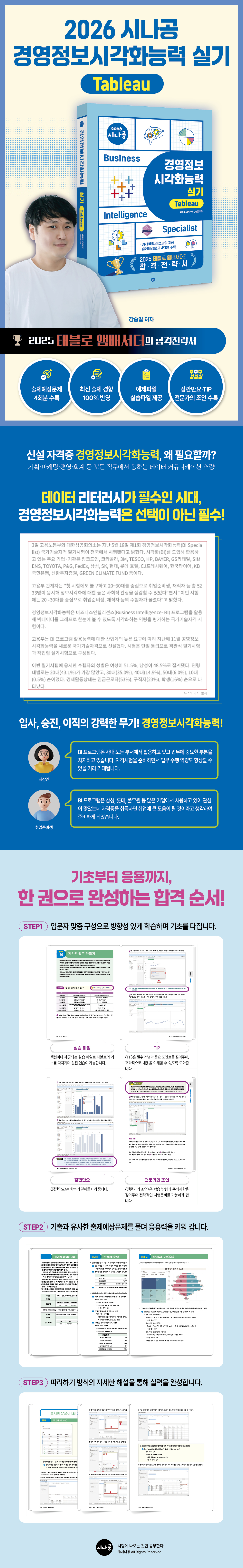 시험에 필수적으로 등장하는 시각화 유형과 분석 방식에 초점을 맞추고, 실제 시험과 유사한 흐름으로 구성된 출제예상문제를 통해 실전 감각을 자연스럽게 익힐 수 있도록 설계되어 있습니다.